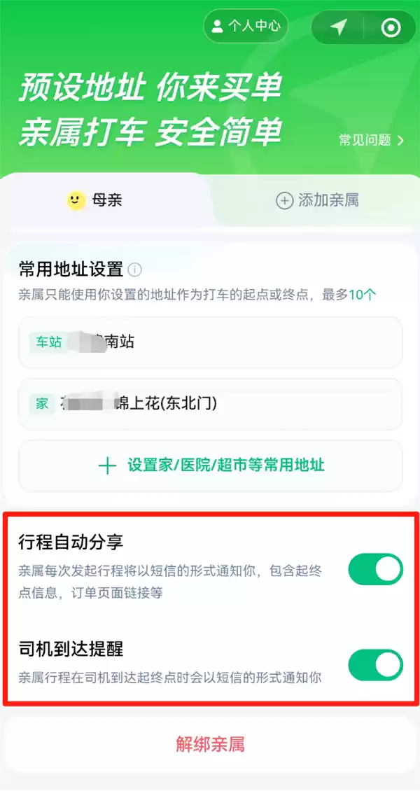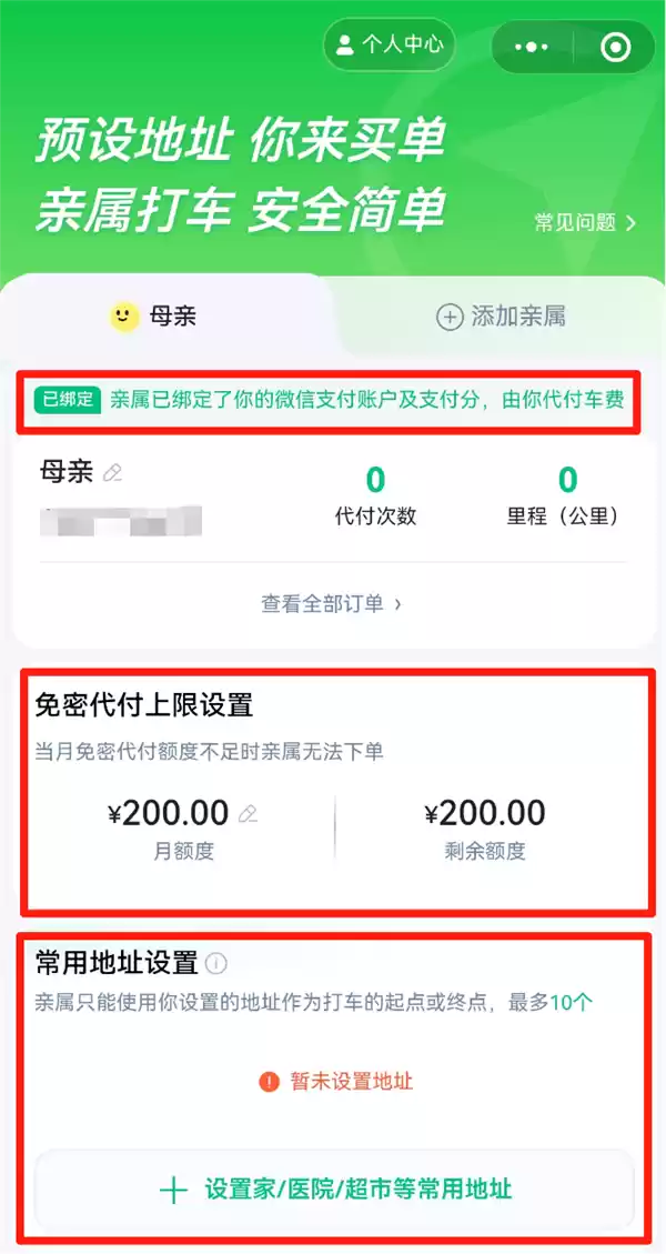 绑定成功后,子女可为父母设置免密支付额度(默认最高200元),并添加家庭住址、医院、车站等常用地点。