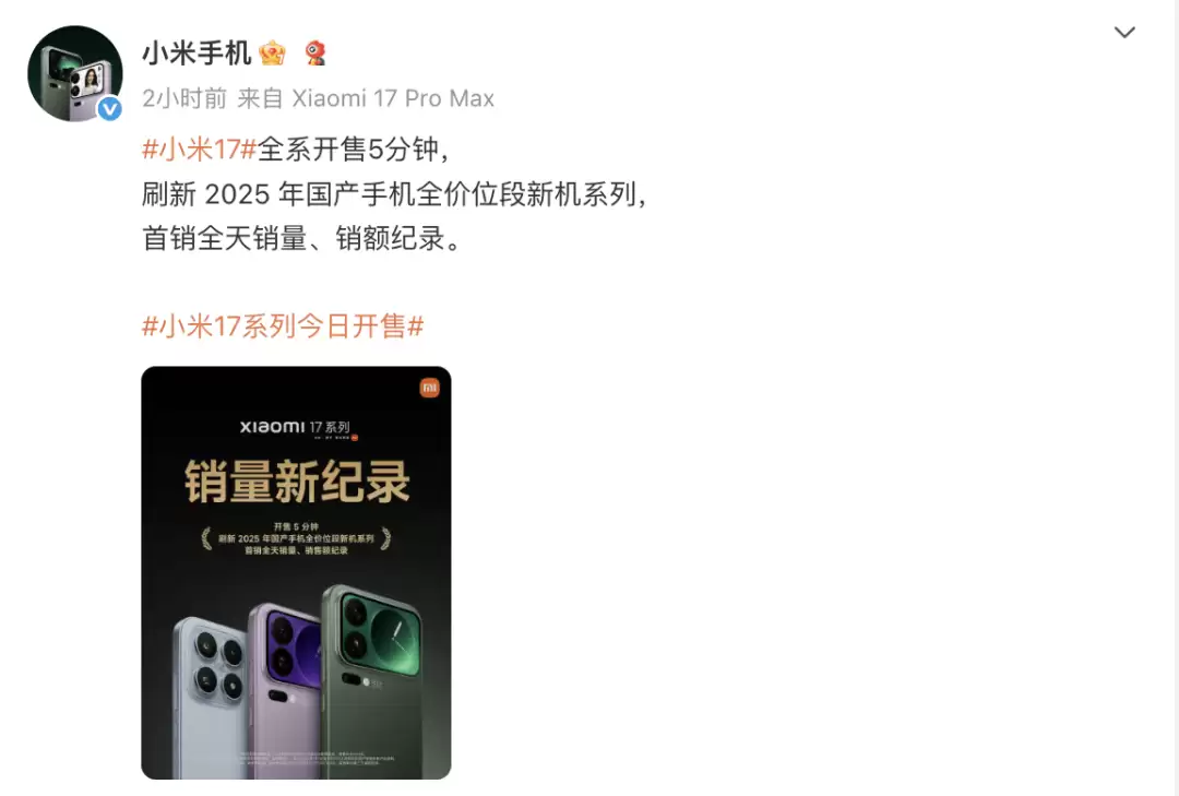 小米17系列首销火爆,5分钟破国产手机销售记录