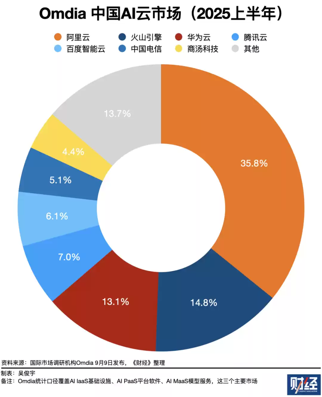 按照Omdia的估算,2025 年上半年中国AI云市场总收入31亿美元(约合221亿元)。其中,阿里云占比35.8%、火山引擎占比14.8%、华为云占比13.1%、腾讯云占比7.0%、百度智能云占比6.1%、中国电信占比5.1%。
