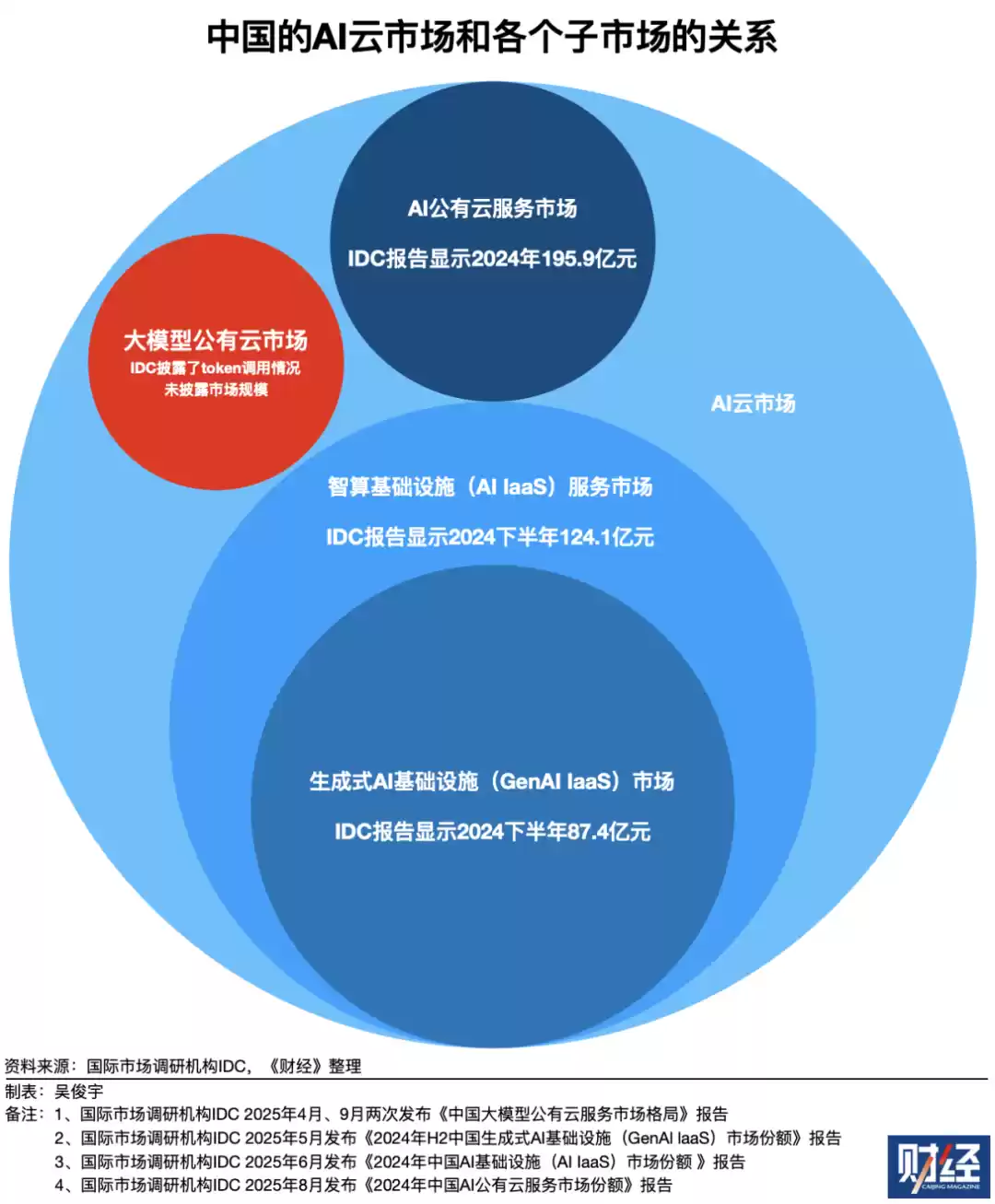 IDC的调研口径相比Omdia的调研口径更全、更细。但它这五份报告,把AI云市场切成了四个细分市场——智算基础设施(AI IaaS)服务市场、生成式AI基础设施(GenAl laaS)市场、AI公有云服务、大模型公有云市场。
