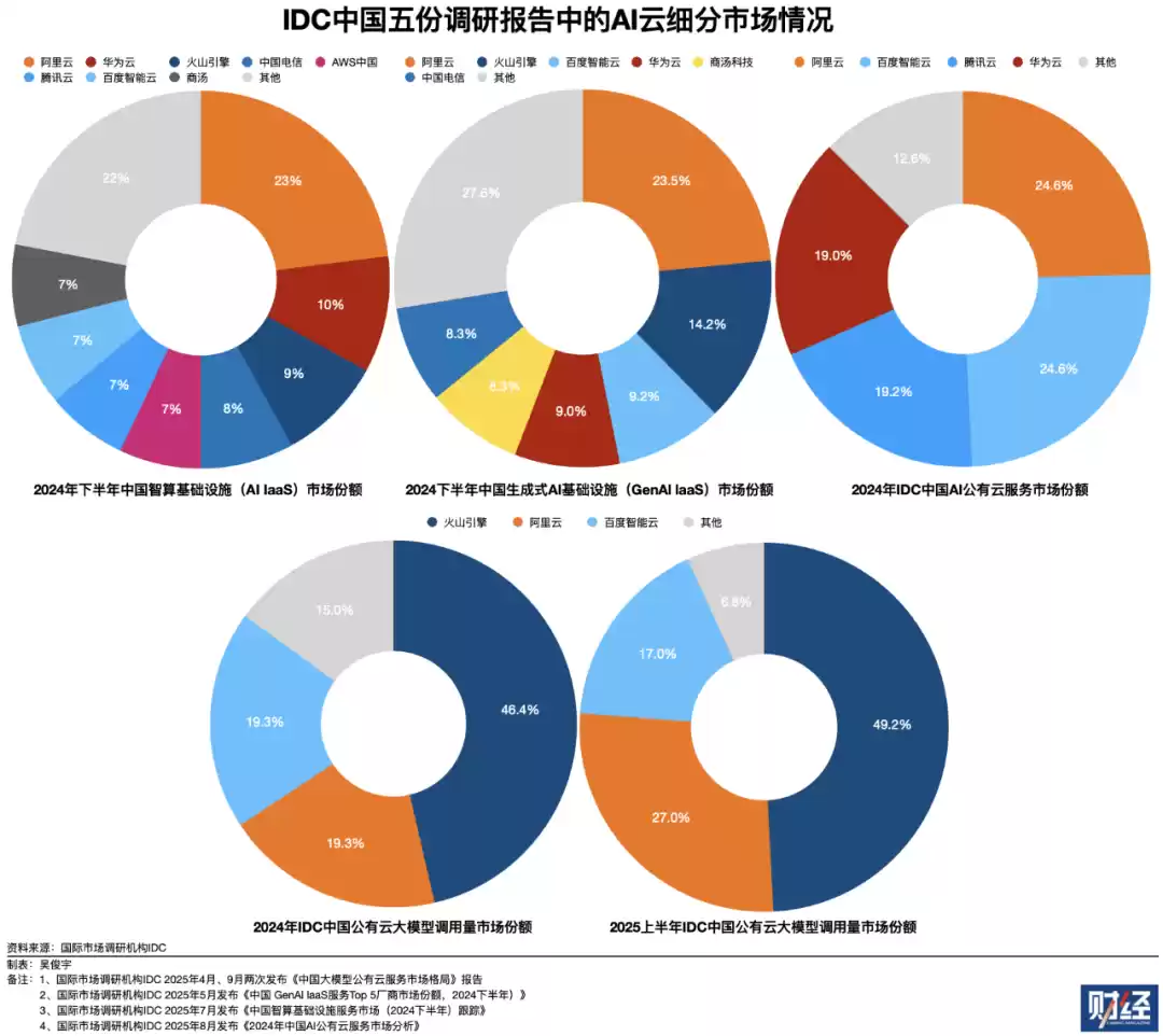 2025年之前,火山引擎几乎从来没有出现在主流市场调研机构的统计中。增速快、规模大,这让市场调研机构已经无法忽略火山引擎的存在。2025年之后,火山引擎几乎在每份调研报告排名都位居前列。一位云厂商资深人士今年9月对《财经》表示,火山引擎如果保持60%以上的高增速,2026年将跃升为中国第五大云厂商。