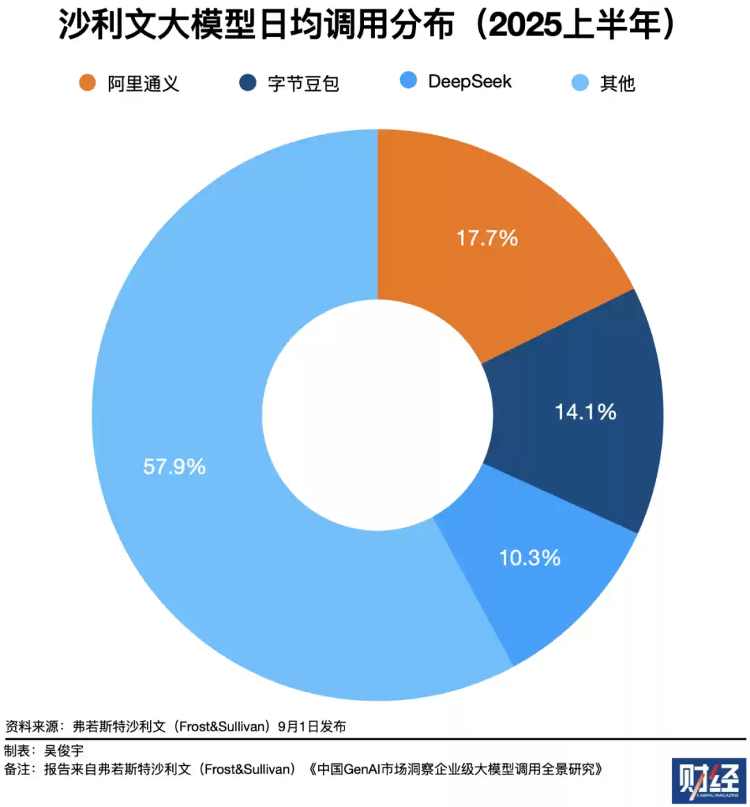 沙利文的调研口径则是最窄的。它只统计了阿里的通义、字节跳动的豆包、DeepSeek等几款大模型在2025上半年日均调用分布情况。