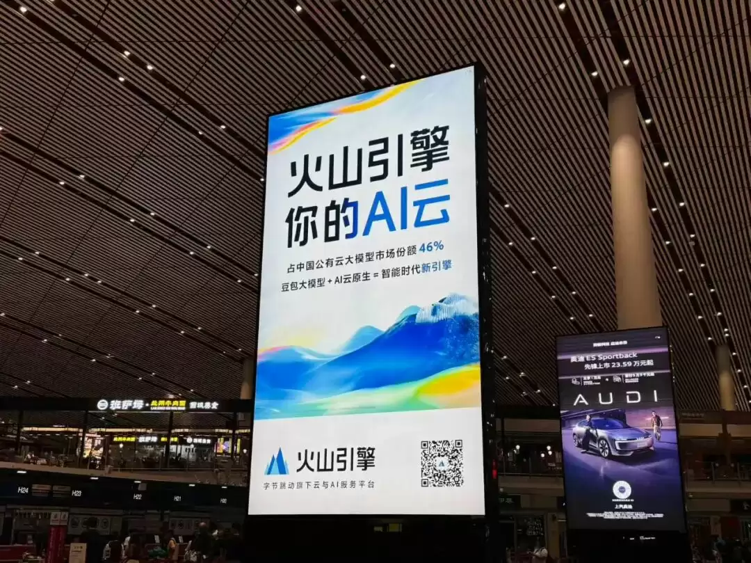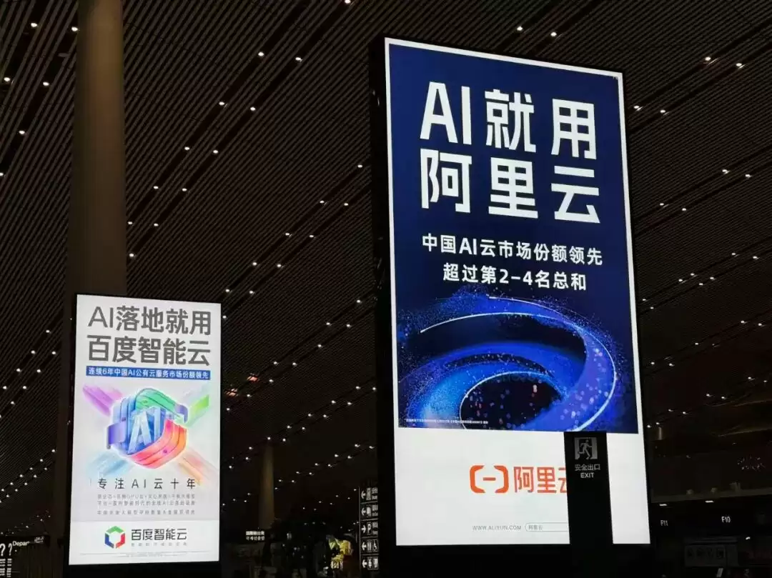 北京首都机场,阿里云、字节跳动旗下云服务火山引擎、百度智能云的广告占据了醒目位置。阿里云的广告标语是“AI云市场份额领先,超过第2-4名总和”,火山引擎的广告标语是“占中国公有云大模型市场份额46%”。百度智能云的广告标语是“连续六年中国AI公有云市场份额领先”。