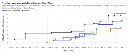首先,Mistral AI虽然是目前估值最高的大模型独角兽之一,但他们的产品在市场中并不受欢迎——阿姆斯特丹大学近期发布了一份调查报告显示Mistral在整个大模型赛道内的市场份额只有2%,在2025年1月之后快速地被Deepseek和OpenAI拉开差距——这意味着Mistral无论是在产品差异上还是使用体验上,都没有拿出具有说服力的表现。