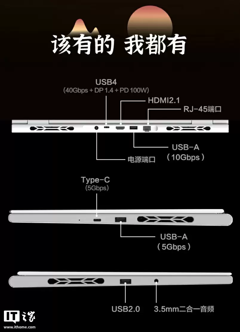 接口配置相当丰富:左侧设有1个USB-A 2.0接口和3.5mm音频接口;右侧配备1个USB-C 5Gbps接口和1个USB-A 5Gbps接口;后方则集成了USB4高速接口、HDMI 2.1视频输出、RJ45网口以及USB-A 10Gbps接口。