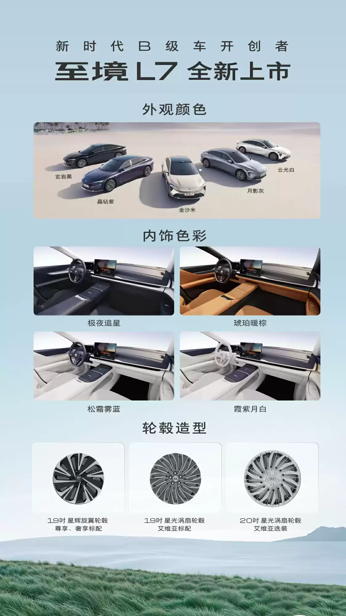 至境L7采用开创性的"水生美学"设计理念,整车尺寸达到5032mm×1952mm×1500mm,3000mm的超长轴距直逼C级豪华轿车。新车配备了全车无框车门、隐藏式门把手、银河星空展翼大灯组和20英寸星光涡扇轮毂等高端配置,并提供六种个性化车身颜色选择。