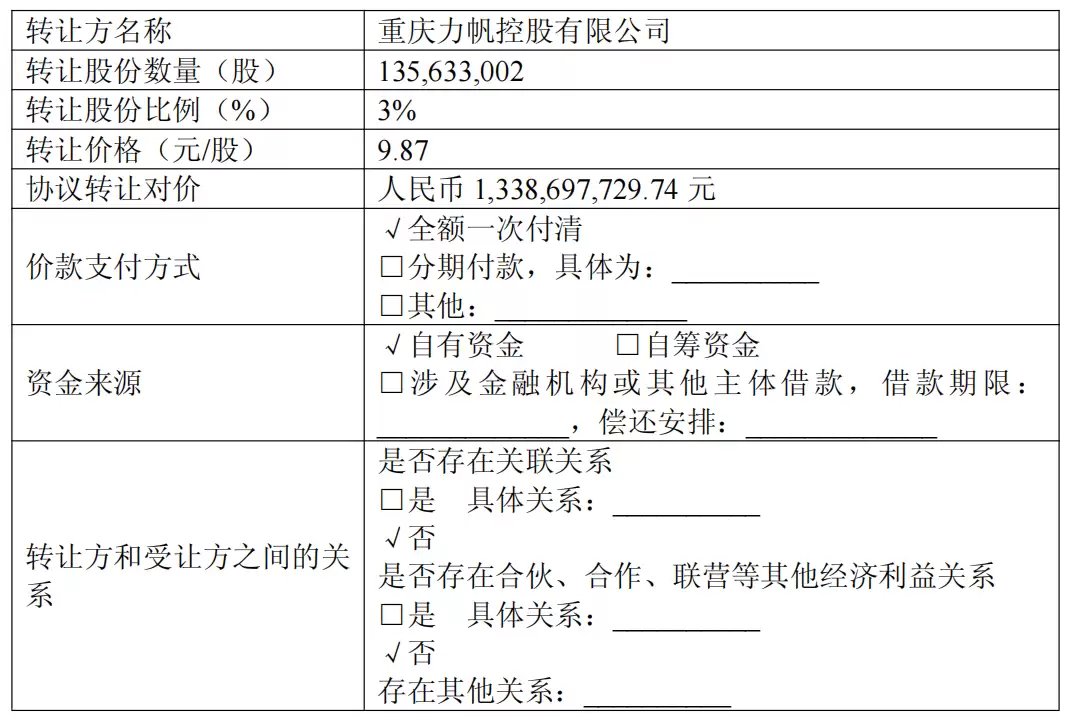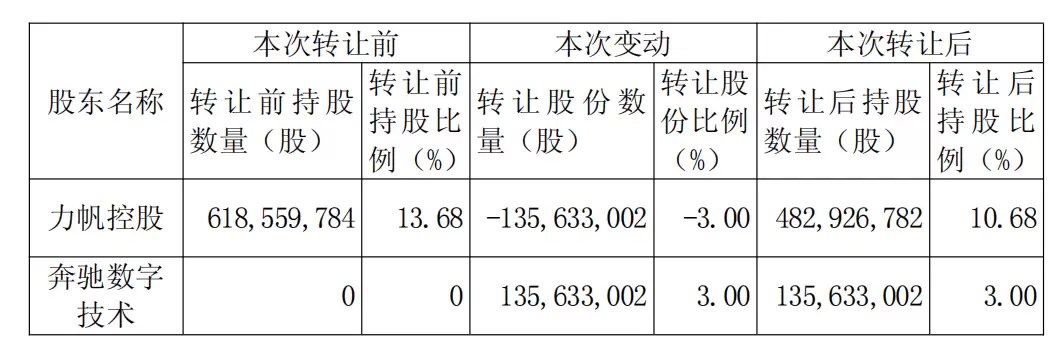 完成交易后,力帆控股的持股比例,将从13.68%降到10.68%。