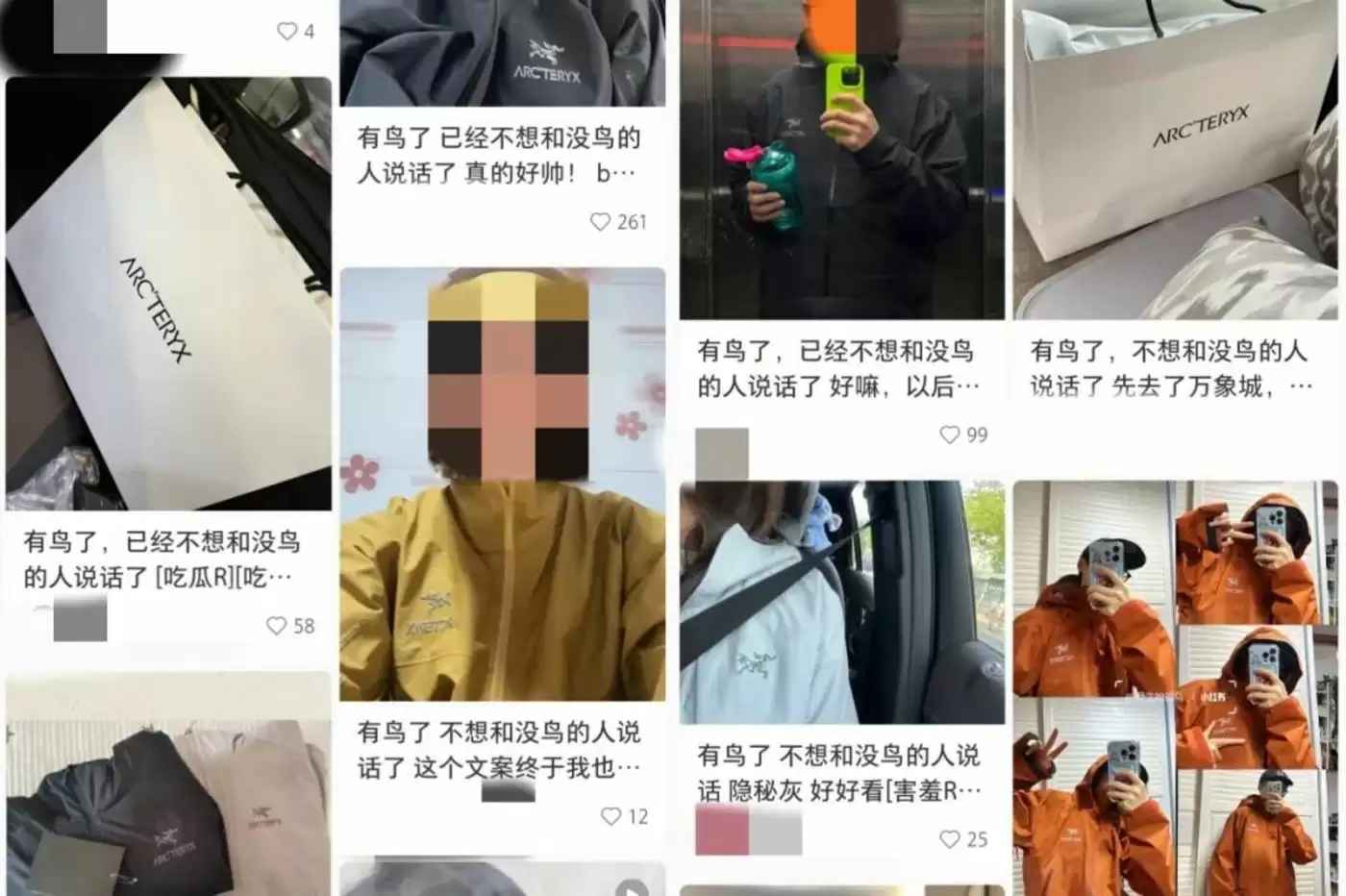 毕竟过去两年,“鸟人”几乎已经演变为一种社交身份符号,小红书上“鸟人博主”给战服排兵布阵、分享“买鸟经验”,户外“鸟人“的身影出没在雪山、峭壁和草原里,即便不在户外,都市“鸟人”也要摆出酷酷的姿态晒出今日穿搭并打上Arc'teryx的标签。