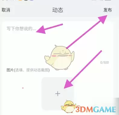 3、在弹出的编辑页面编写文字,添加照片后,点击发布即可完成动态分享