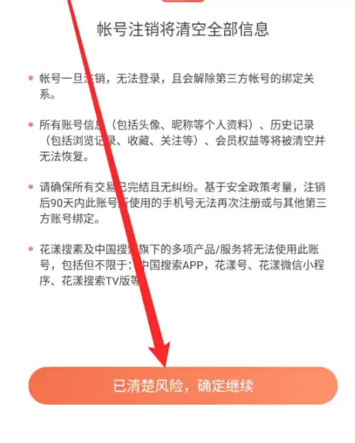 最后在注销页面确认风险提示,点击"已清楚风险,确定继续"完成操作