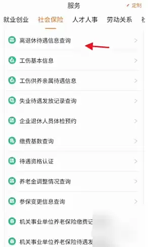 在服务分类中找到"社会保险"板块,选择"离退休待遇信息查询"功能