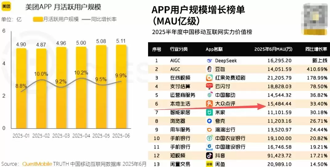 数据显示,美团系用户规模优势明显。调研机构QuestMobile报告指出,2025年6月美团MAU达5.11亿,大众点评MAU亦有1.55亿。