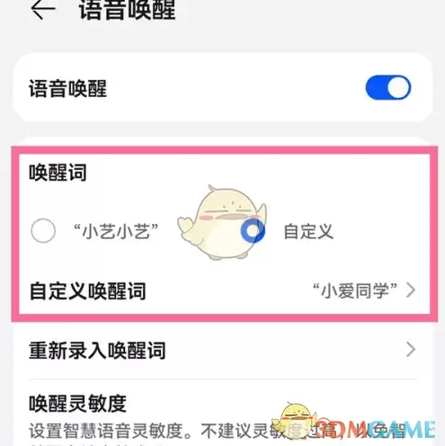 3、开启语音唤醒功能后,点击"自定义"按钮,输入你喜欢的4-6个字唤醒词
