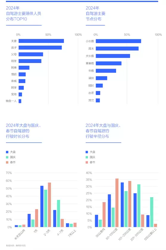 疫情后快速恢复的旅游与快速兴起的自驾游,不仅能创造出中国车市的新机遇,而且能打造出鲜明的中国特色:2024年,在中国自驾游的旅程中,夫妻与孩子是最主要的同行者,二者占比均超过七成,父母陪伴出行的占比也超过了四成,而独自一人自驾出游的情况极为少见,这与欧美地区单人出游占比较高的情况形成了鲜明反差;中国自驾游的时间节点主要集中在小长假与周末,二者合计占比约七成,其次是大长假与寒暑假,而利用年假随时出行的比例相对较低,估计真正能充分享受年假福利的企业还不多;中国自驾游的行程周期大多集中在2 - 3天,出行半径多在一两百公里以内,国庆假期则有所不同,行程周期集中在4 - 7天,出行半径超过200公里,而春节期间的自驾游天数和半径均低于整体平均水平,主要以城市周边游或前往周边城市游玩为主。