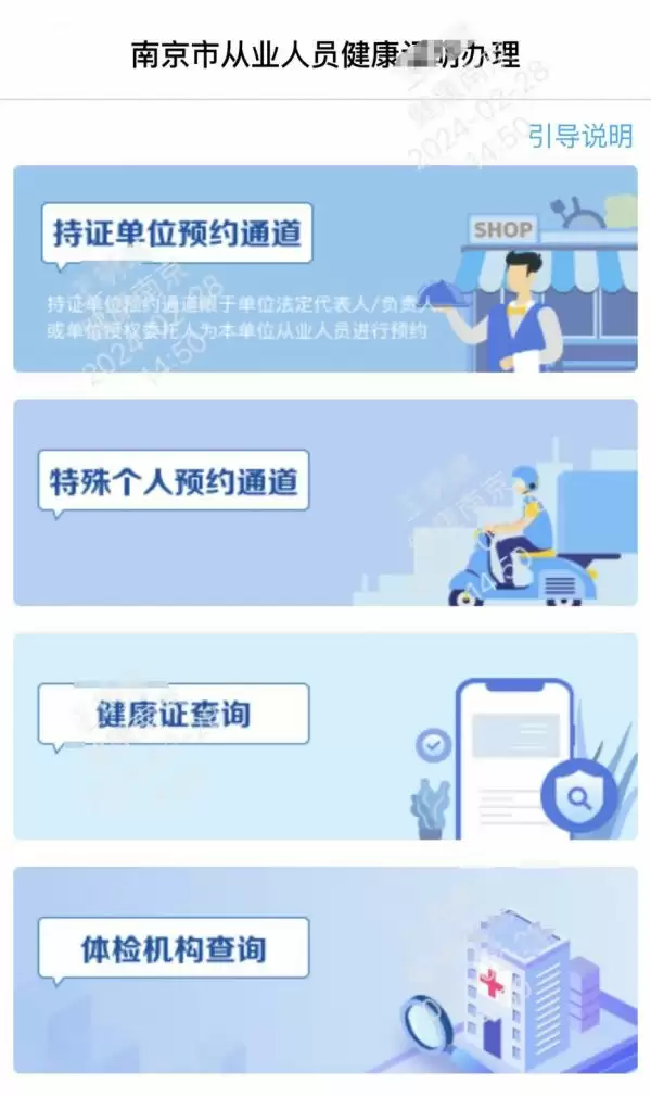 下载“健康南京”APP,用手机号注册并完成实名认证,进入首页后点击“更多”-“健康证体检”,企业用户通过“持证单位通道”注册审核后为员工预约,个人用户(如外卖骑手等特定人员)通过“