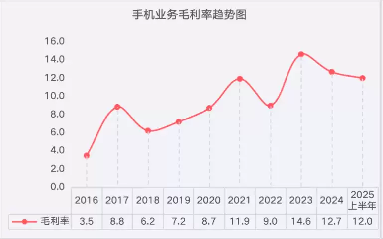 财报显示,小米手机业务的毛利率已从早期的2%左右提升至近年来的两位数水平,2016年小米手机业务毛利率为3.45%,高端化后,2024年该数据突破了10%,近三年维持在12%左右。