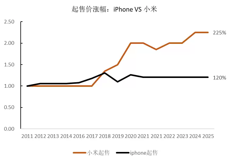 小米手机的十余代产品以来,从一开始的性价比定位到高端定位,其手机定价步步高升,甚至超过了苹果的同期涨幅。与此同时,尤其近五年来,苹果则“加量不加价”。
