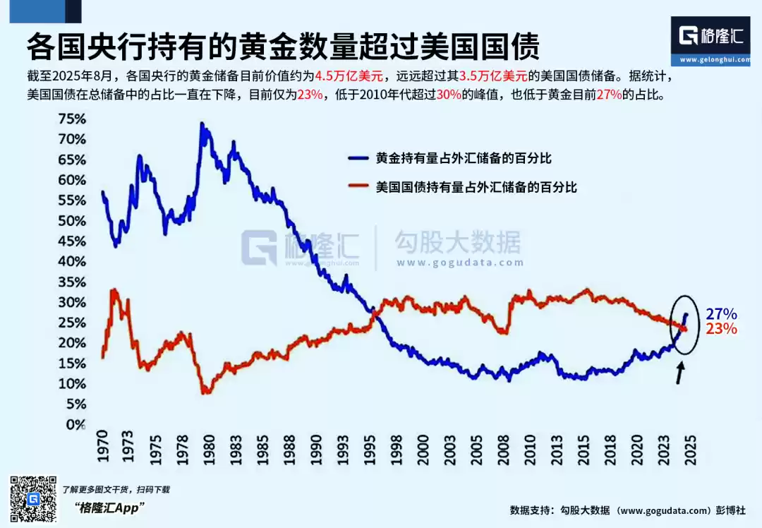 从资金层面来看,近年来,不仅是商业机构在买入黄金,全球各国央行也在大举下场买入黄金。截至2025年8月,各国央行的黄金储备目前价值约为4.5万亿美元,已经远远超过其3.5万亿美元的美国国债储备。据统计美国国债在总储备中的占比一直在下降,目前仅为23%,低于2010年代超过30%的峰值,也低于黄金目前27%的占比。