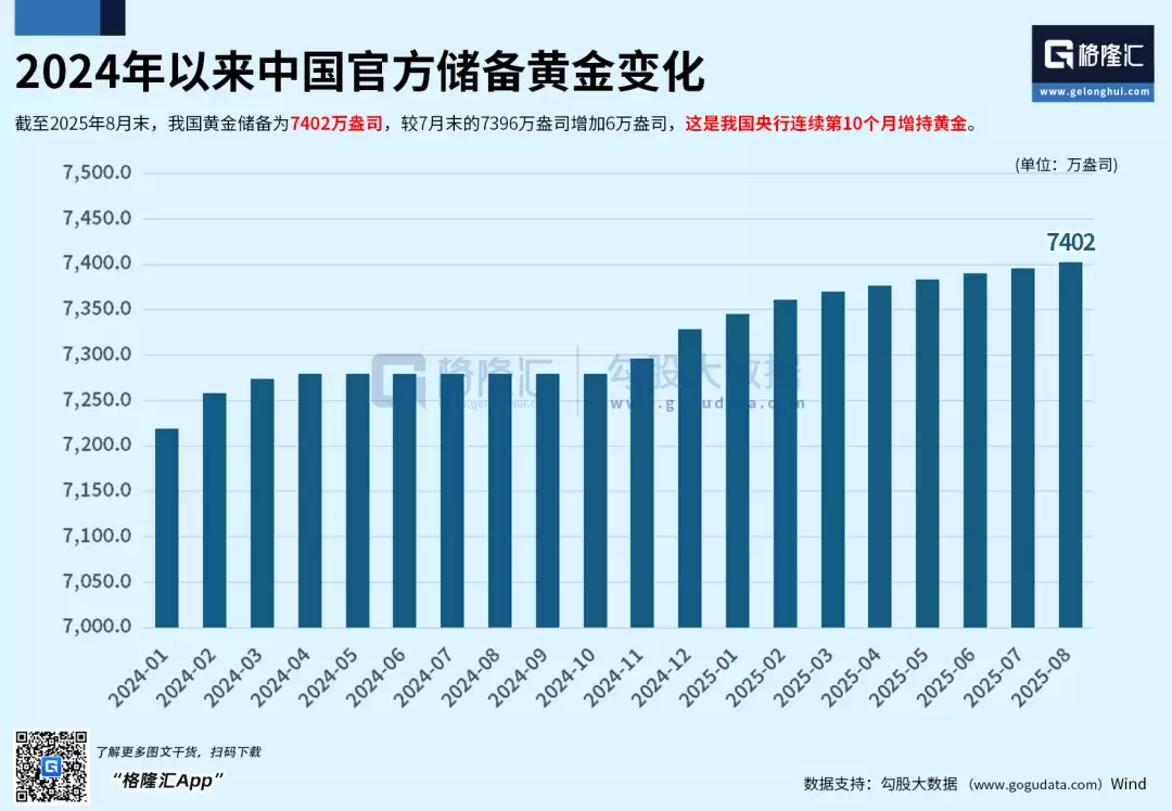 还有我国央行最新的买入黄金数据显示,截至2025年8月末,我国黄金储备为7402万盎司,较7月末的7396万盎司增加6万盎司,这是我国央行连续第10个月增持黄金。2025年1-7月,我国央行累计购金量达36吨。