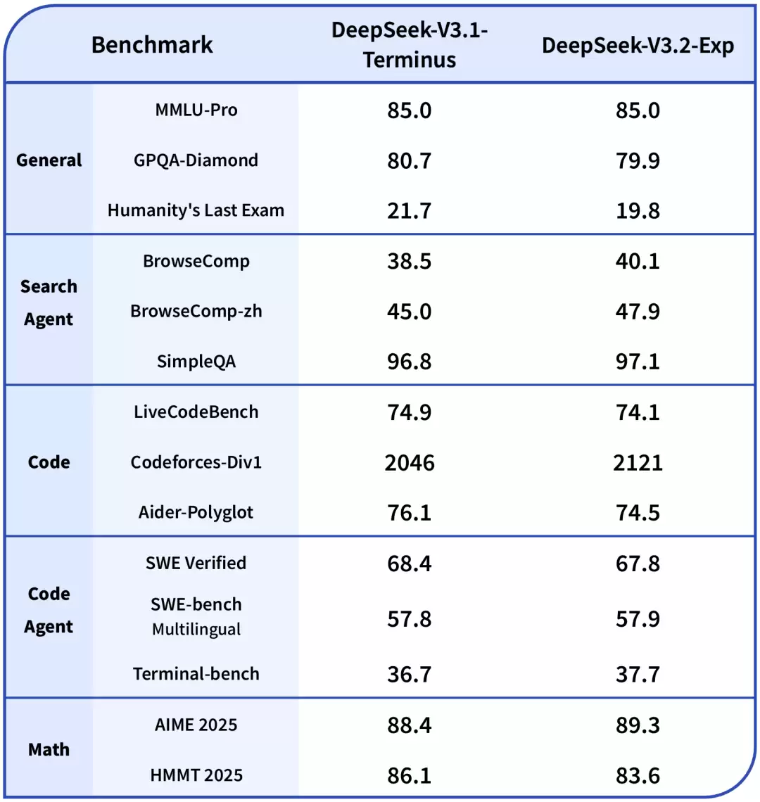为了评估引入稀疏注意力机制的影响,DeepSeek方面特意将DeepSeek-V3.2-Exp的训练配置与V3.1-Terminus进行了对齐。在各个领域的公开基准测试中,DeepSeek-V3.2-Exp的表现与V3.1-Terminus相当。