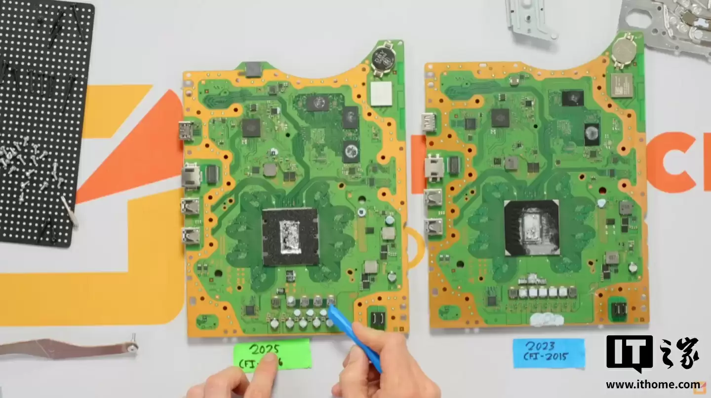 当拆解至主板级别时,可以看到CFI-2100版多出了一枚NAND存储芯片,使总数达到3颗。最引人注目的改进在于液态金属散热系统:索尼在散热模组中增加了专门的导流脊结构,有效防止主机垂直放置时液金溢出。