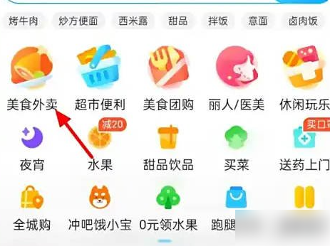 1、打开饿了么App,在首页上方选择"美食外卖"分类。