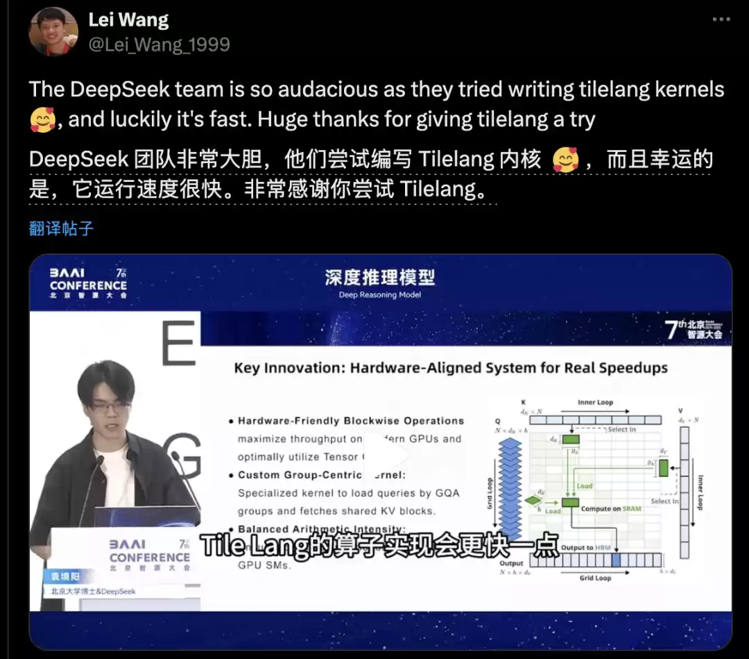 在DeepSeek实习过的北大博士袁境阳,在报告中就提到“TileLang的算子实现会更快一点”。