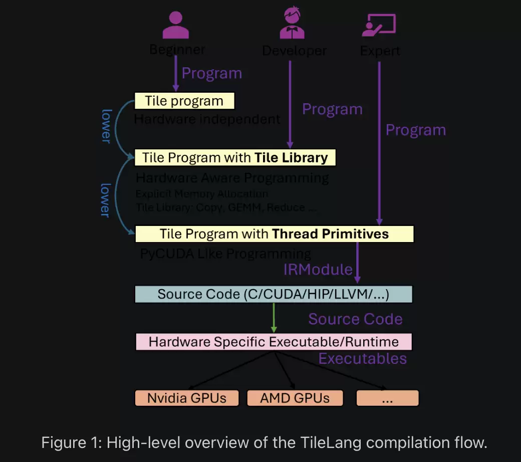 TileLang提供了三个不同层次的编程接口,满足不同水平开发者的需求。