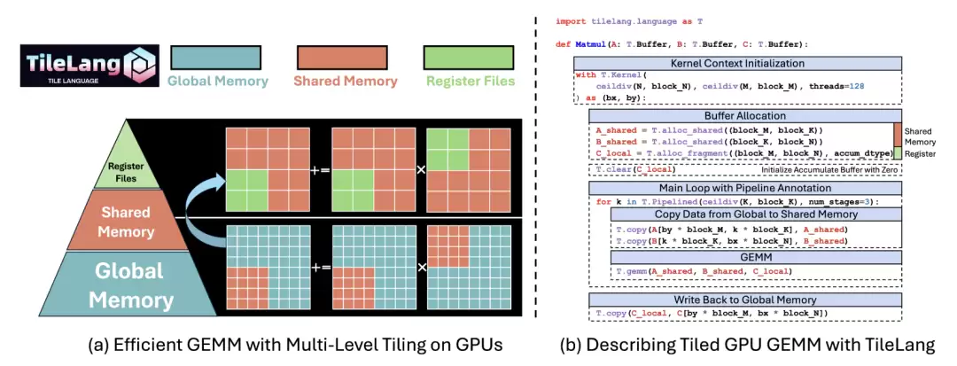 TileLang将“Tile”作为编程模型的核心概念,通过显式的Tile抽象,让开发者能够直观地控制数据在全局内存、共享内存和寄存器之间的流动。