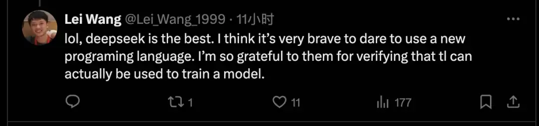 TileLang的发起人之一,北大博士研究生王磊当时还专门发帖感谢DeepSeek尝试他们的语言。