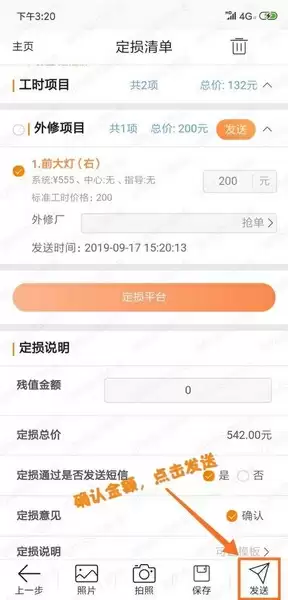 2、确定为外修的配件,需进入定损页面点击发送外修,并将配件实物照片上传至指定栏目。