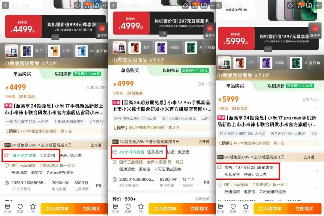 在发货时效方面,京东平台显示,小米17与小米17 Pro当日23:10前下单能够次日到达,而17 Pro Max则需等待至10月13日后才有货源;淘宝平台同样反映出类似的供应节奏,小米17与17 Pro支持48小时内发货,顶配版17 Pro Max则需等到10月9日前才能安排发货。