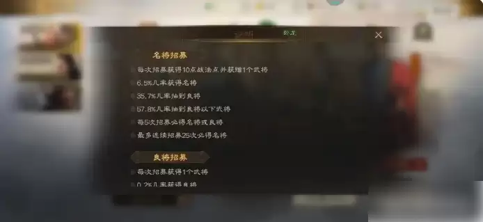 这是唯一有明确保底机制的招募方式,需消耗金铢进行招募: - 招募5次必定获得1位名将 - 招募15次可额外再获1位名将 - 累计30次必得30位名将 武将池包含夏侯渊、颜良、黄忠等强力武将,名将获取概率为6.5%,良将概率35.7%。