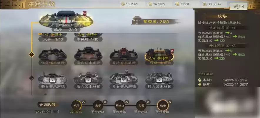 这两类建筑各具特色:演武场虽然需要消耗兵力进行扫荡,但经验获取效率极高;校场则无需任何消耗,采用挂机积累模式,特别适合在离线前安置武将,次日上线即可收获经验收益。其次是阵容扩容策略,游戏支持最多5人同时出战,但受限于前期统御值限制。建议优先升级政厅提升统御上限,解锁更多出战名额自然能显著增加总兵力规模。