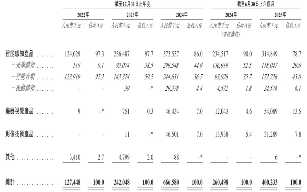 聚芯微电子2025年上半年来自光学感知方面的收入为1.18亿元,占比为29.6%;来自智能音频领域的收入为1.72亿元,占比为43%;聚芯微电子2025年上半年来自振动感知领域收入为2458万元,占比为6.1%;来自机器视觉产品收入为5409万元,占比为13.5%;来自影像技术产品收入为3129万元,占比为7.8%。