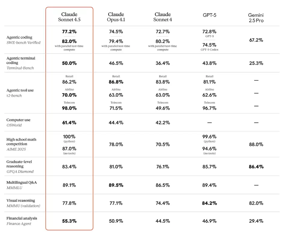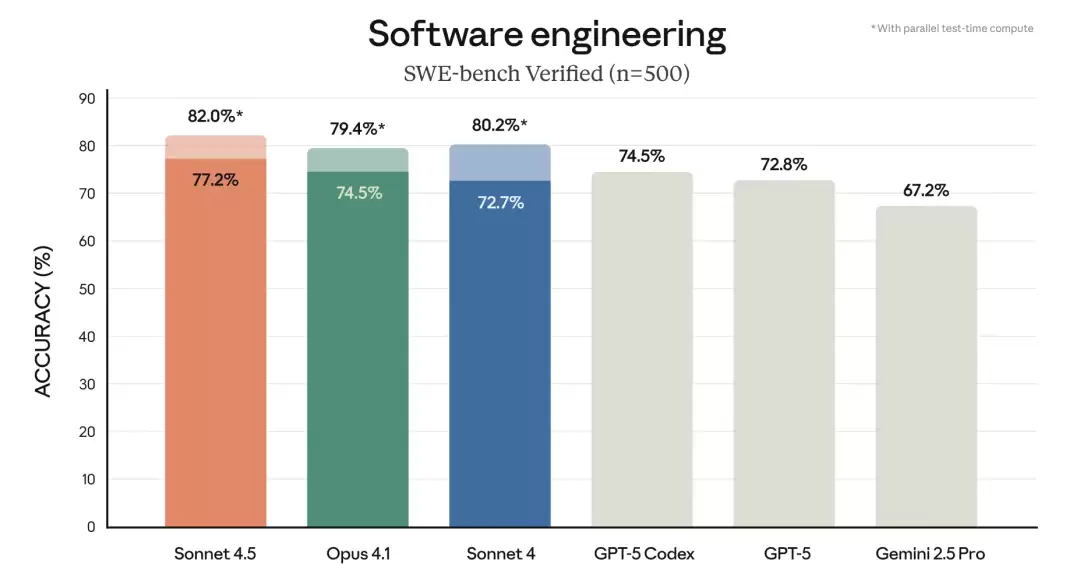 根据最新测试结果显示,Claude Sonnet 4.5 在SWE-bench Verified评测里拿下了顶级成绩,这个测试主要看模型在真实世界里写代码的水平。
