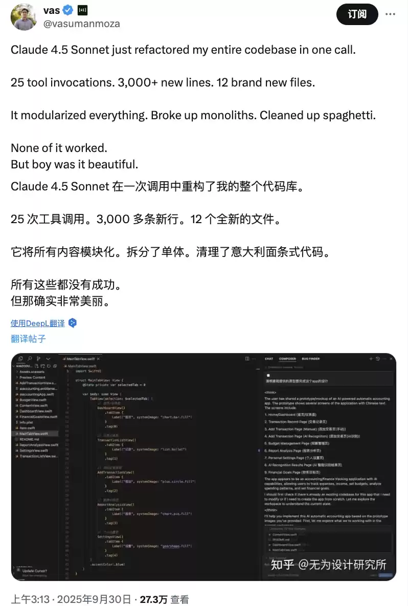 “Claude 4.5 Sonnet 一次调用就重构了我的整个代码库。