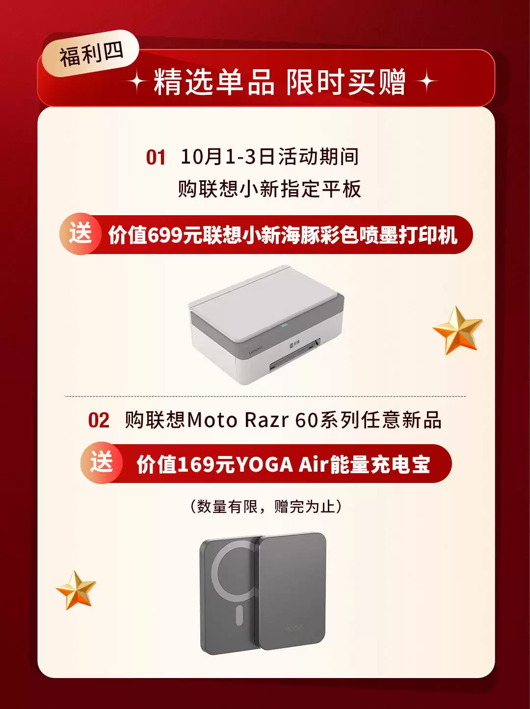 针对追求高效与时尚的消费者,联想在国庆期间推出买赠礼遇,让智能设备与实用赠品深度结合,一站式提升使用体验。到线下门店选购联想小新指定系列平板,可获赠价值699元的小新海豚彩色喷墨打印机;选择潮流折叠屏联想moto razr 60系列任意新品,则可免费得价值169元的YOGA Air能量充电宝。如果你选择搭载高通骁龙8Gen 3旗舰芯片、性能惊艳的联想小新Pad Pro GT平板电脑时,配合随机赠送的小新海豚彩色喷墨打印机,可轻松实现“课堂笔记即时整理、报告撰写一气呵成”的高效学习场景——仅458克的轻薄机身方便携带穿梭于教室与图书馆,而打印机的加持更让资料输出随时可达,宿舍学习效率倍增。