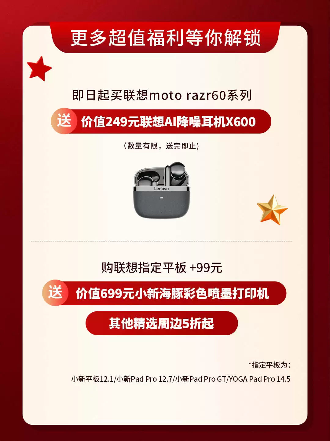 即日起购买联想moto razr 60系列,还可附赠价值249元的联想AI降噪耳机X600,无论是在嘈杂的旅途还是需要专注的学习环境中,都能为用户带来沉浸式的音频体验。购机用户还可享受精选周边产品5折起优惠,购买联想指定平板机型加99元即得小新海豚打印机等等。多项福利联动,助力大家在国庆期间都能轻松配置想要的AI装备。