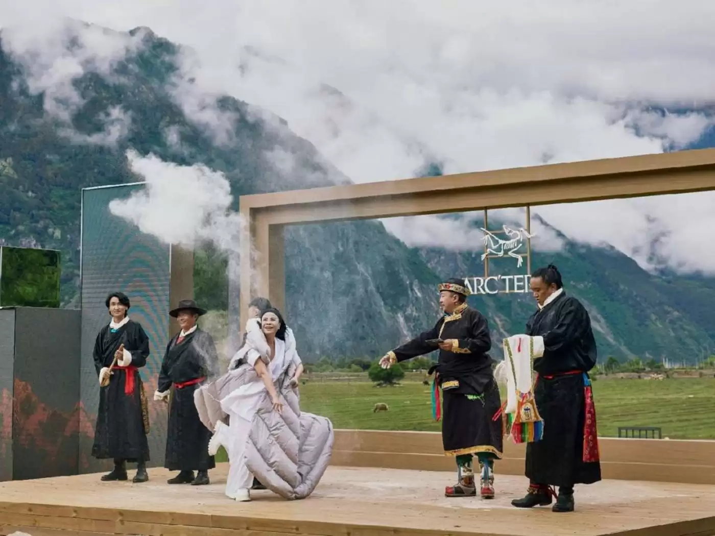 2024年,始祖鸟“向上致美”系列第一步就干到了云南香格里拉,首次将秀场搬到海拔3300米的高原山谷,以雪山、青稞架为天然背景,让登山家、藏族青年和专业模特同台,揭开首个始祖鸟与松赞联名产品“卡瓦格博”系列的面纱。