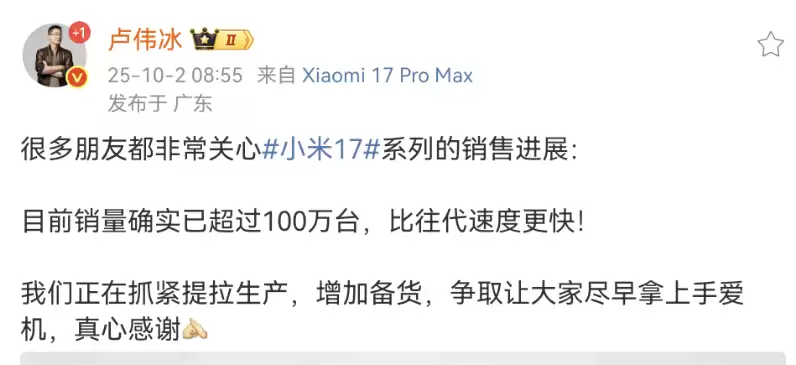 小米17系列百万销量达成,卢伟冰宣布加速增产