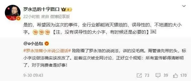针对这一现象,罗永浩在直播中表示,在宣传中用小字补充说明是行业普遍现象,并非小米独有。他指出,许多厂商会在“最强”“最佳”等关键词前加小字“目标成为”,以规避广告法限制。虽然这种做法符合法规,但可能误导消费者。罗永浩强调,希望全行业能消除这种不地道的宣传方式。