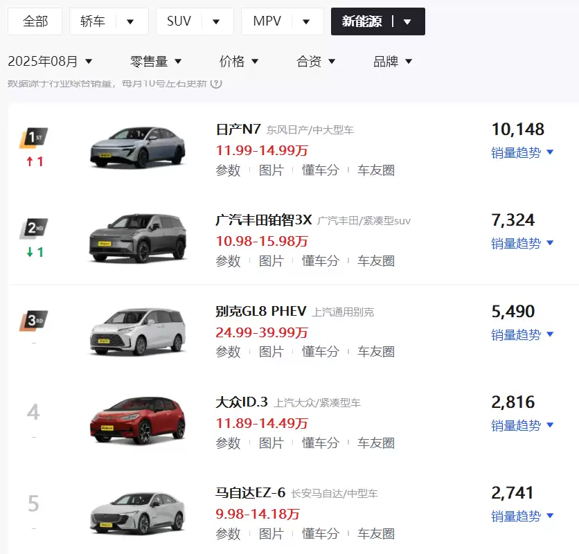 市场表现方面,合资新能源车型已形成差异化竞争格局。数据显示,2025年8月纯电动中大型轿车日产N7以10148辆的月销量登顶合资新能源榜首,该车型自4月上市后仅用4个月便突破万辆大关。紧随其后的广汽丰田铂智3X和别克GL8 PHEV分别以8762辆和7543辆位列二三名,展现出合资品牌在混动和纯电领域的双重发力。