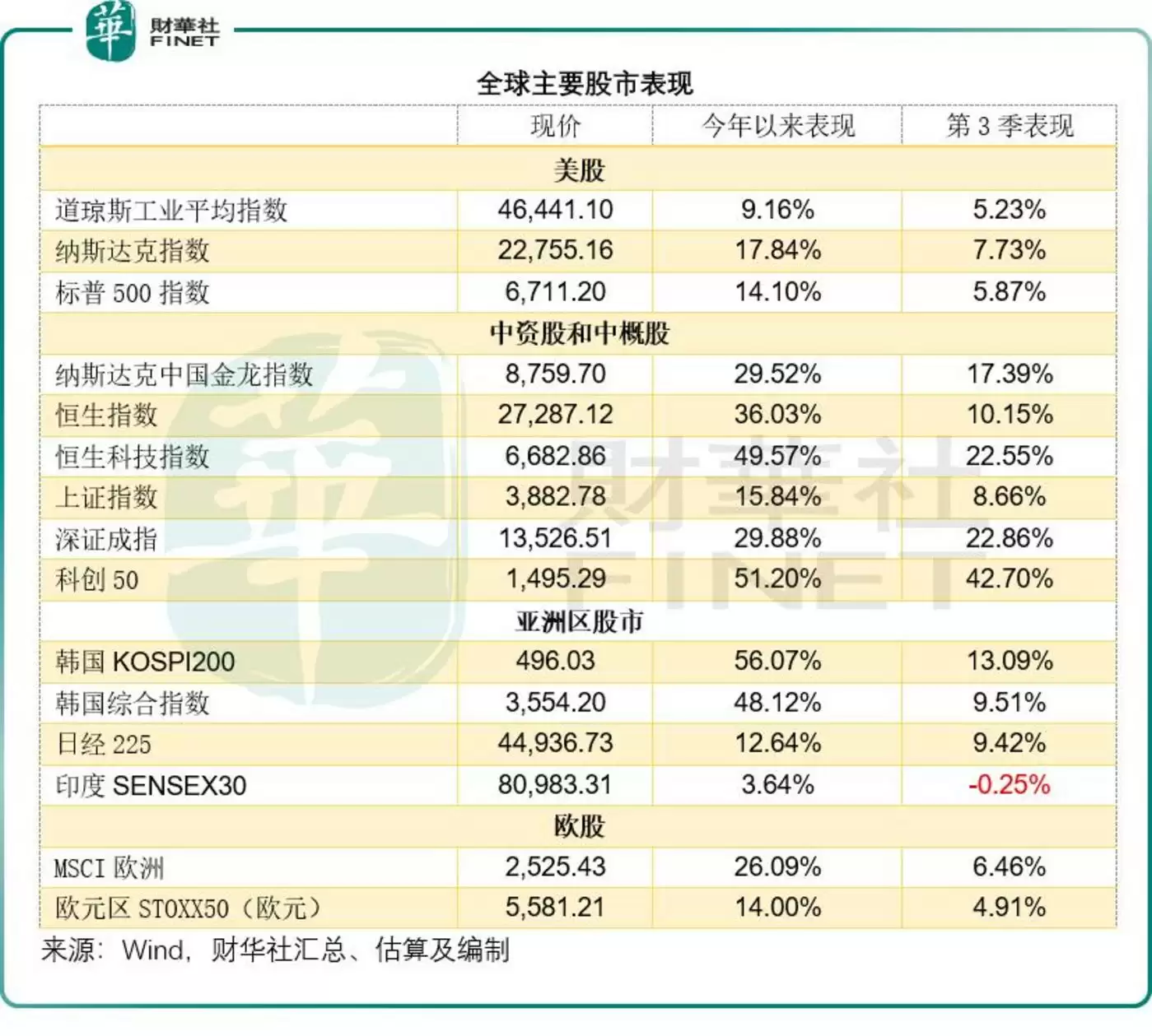 2025年第3季,韩国KOSPI200指数和韩国综合指数的累计涨幅分别只有13.09%和9.51%,而恒生指数和恒生科技指数的季度累计涨幅却分别达到10.15%与22.55%,“百年不动”的A股也有了“动一动”的行情,上证指数、深证成指和科创50的第3季累计涨幅分别为8.66%、22.86%和42.70%,跑赢全球大部分股市。