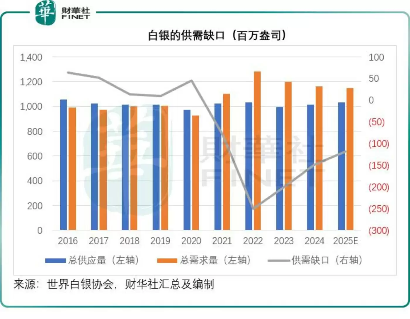 2)供应缺口持续:白银在工业领域也有广泛的引用,例如光伏、新能源汽车生产等工业领域都需要用到白银,这给银价提供了刚性支撑,同时钱币铸造、实体商品ETF投资需求殷切也推动了对银的需求,但另一方面,世界白银协会的数据显示,不考虑ETP(交易所交易产品)的投资,今年白银的供应缺口仍高达1.18亿盎司,见下方截图,自2024年以来,白银就一直处于供应缺口。