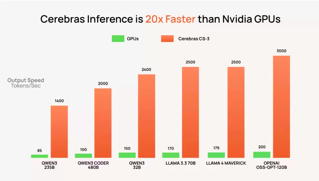 Cerebras声称,在过去的一年里,Cerebras每天都保持着性能冠军的宝座,在开源和闭源模型上,其速度通常比Nvidia GPU 快20倍以上。