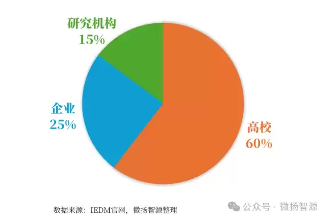 按照第一作者所在机构类型统计,在中国内地的入选论文贡献中,高校占据了绝对主导(约81%),而企业占比相对较低。这反映出国内强大的学术研发能力,同时也暗示了从“学术论文”到“产业成果”的转化路径仍有提升空间。反观美国,其企业界的贡献占比(约33%)显著更高。IBM研究院、英特尔、高通、美光科技、应用材料等巨头在IEDM上比较活跃,积极展示其最新的技术突破。这不仅体现了其深厚的技术储备,更是一种将前沿研究成果与市场领导力绑定的战略展示。