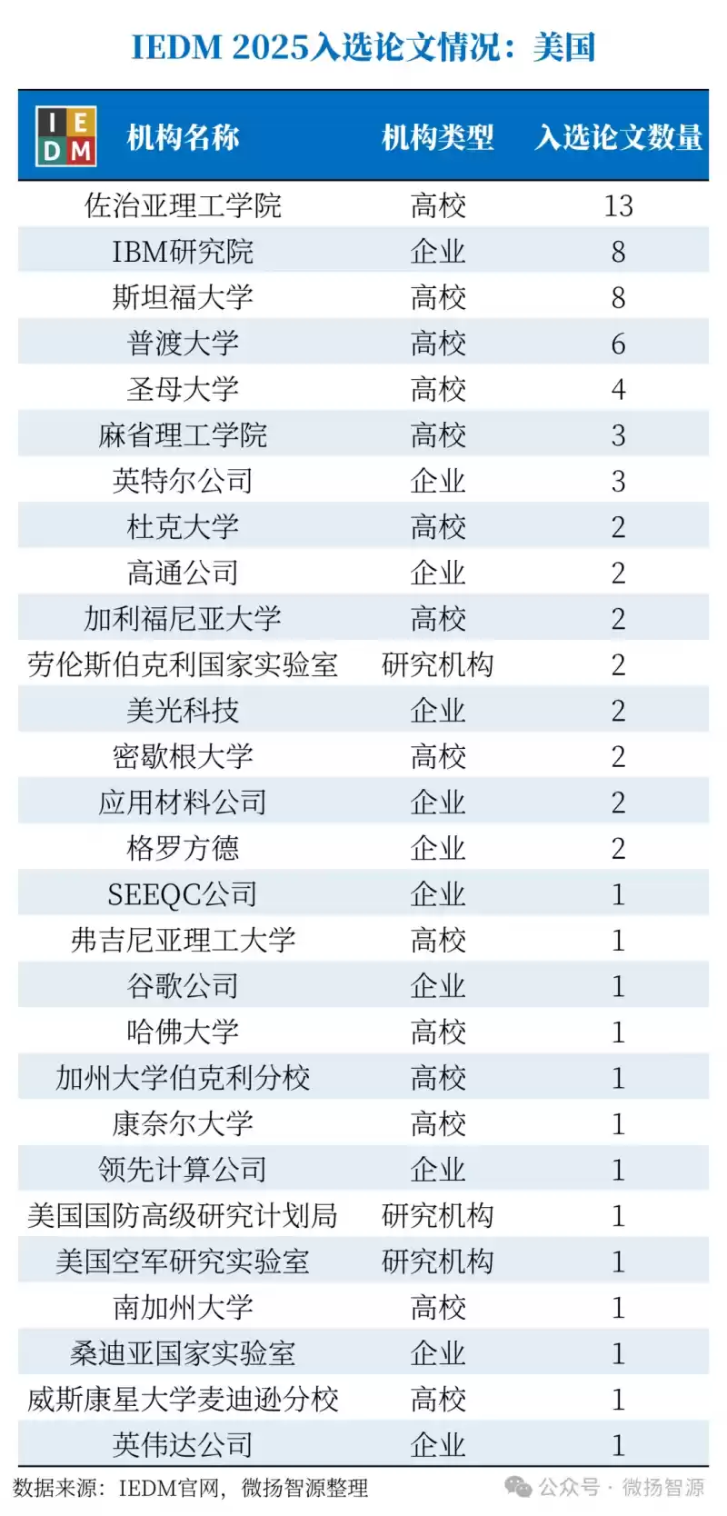 IEDM 2025美国入选论文共74篇,按照第一作者所在机构统计,74篇论文来自28个机构。排在前5的分别是佐治亚理工学院(13篇)、IBM研究院(8篇)、斯坦福大学(8篇)、普渡大学(6篇)、圣母大学(4篇)。