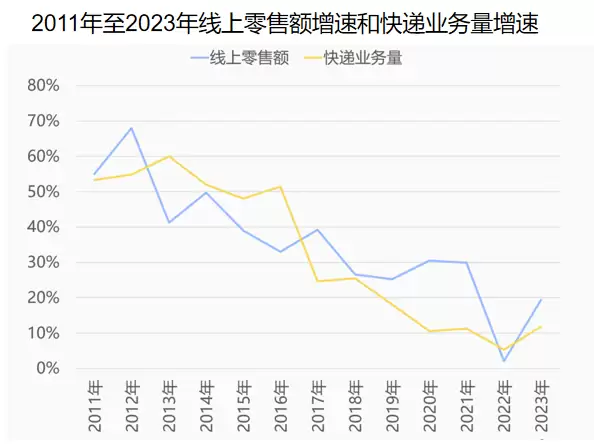 张磊的情况并非个案——过去十多年里,电商件是快递市场增长的最大来源(占比超80%)。自2011年开始,国内快递业务量与线上零售额的增长就高度趋同。但随着线上零售额增速明显放缓,快递市场的增长动力也随之减弱。