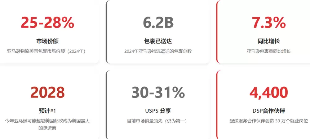 Red Stag Fulfillment数据显示,2024年Amazon Logistics已占据美国包裹配送量的25%~28%。若计入其自营包裹,整体份额高达30%~31%,仅次于USPS。有分析师预测,到2028年,亚马逊甚至可能超越USPS成为美国最大的包裹承运商。